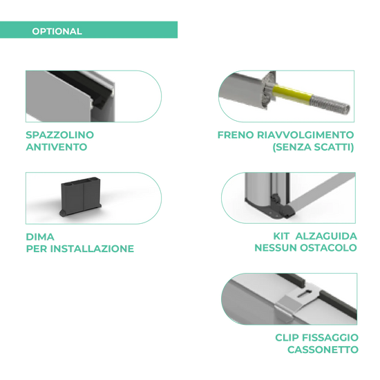• Freno di riavvolgimento: Sistema che consente un riavvolgimento graduale della rete per un utilizzo più sicuro e controllato. NB: Prima di scegliere questo optional assicurati che l’altezza della zanzariera sia superiore a 600mm.