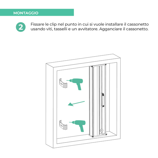 • Fissaggio senza clip: Installazione che non prevede l'utilizzo di clip per il fissaggio del cassonetto. Il fissaggio avviene direttamente sulle testate (inferiore e superiore) del cassonetto.