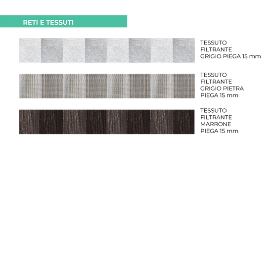 • Tessuto plissettato filtrante: Disponibili in diverse colorazioni (bianco, grigio, grigio pietra, marrone)
