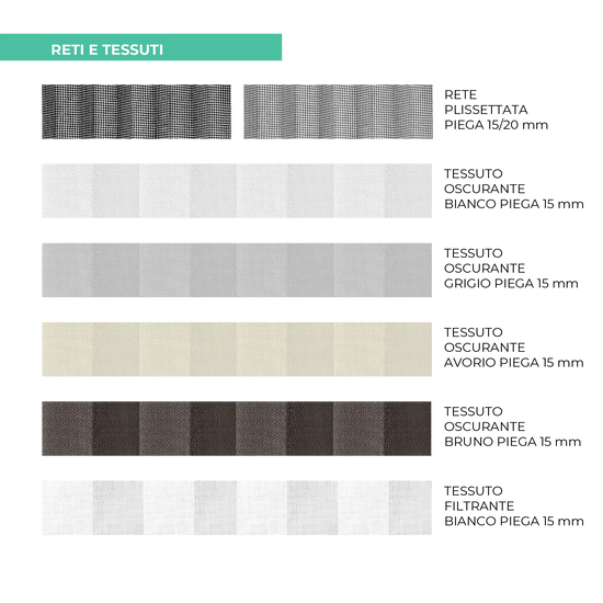 • Tessuto plissettato oscurante: Disponibili in diverse colorazioni (bianco, grigio, avorio, bruno).