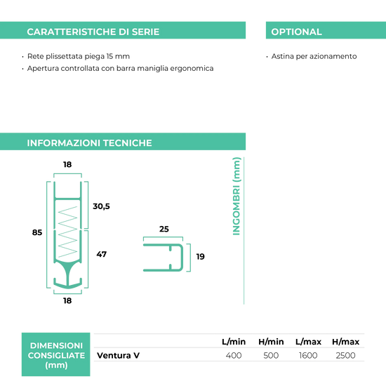 • Ingombro Ridotto: Con un cassonetto di soli 18 mm, Ventura V si adatta perfettamente anche agli spazi più ristretti, rendendola ideale per vani di pochissimi centimetri.