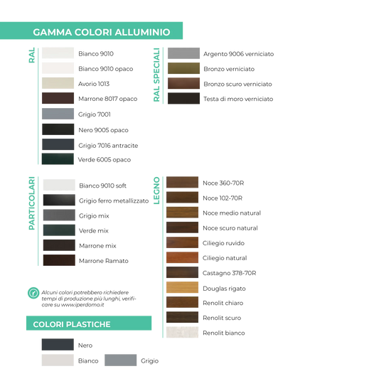Personalizza la tua zanzariera scegliendo tra oltre 25 colori disponibili, inclusi tinta unita e tinta legno, per adattarla perfettamente allo stile della tua casa
