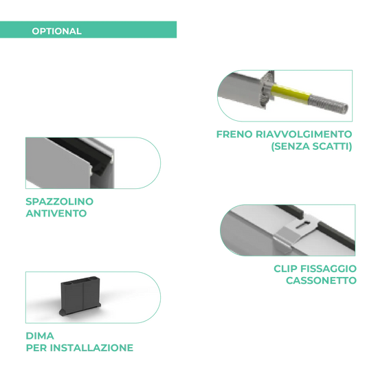 1. Freno di riavvolgimento: Sistema che consente un riavvolgimento graduale della rete per un utilizzo più sicuro e controllato. NB: Prima di scegliere questo optional assicurati che la larghezza della zanzariera sia superiore a 600mm.