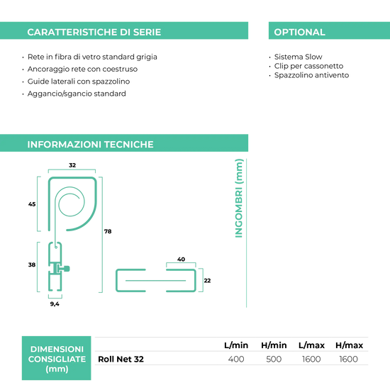 La zanzariera avvolgente Roll Net 32 è la classica zanzariera a molla ad avvolgimento verticale ma in una versione a ingombro ridotto (dimensioni cassonetto: 32 mm). Può essere personalizzata con diversi optional che potrai selezionare in fase di configurazione del prodotto con 1 solo click.